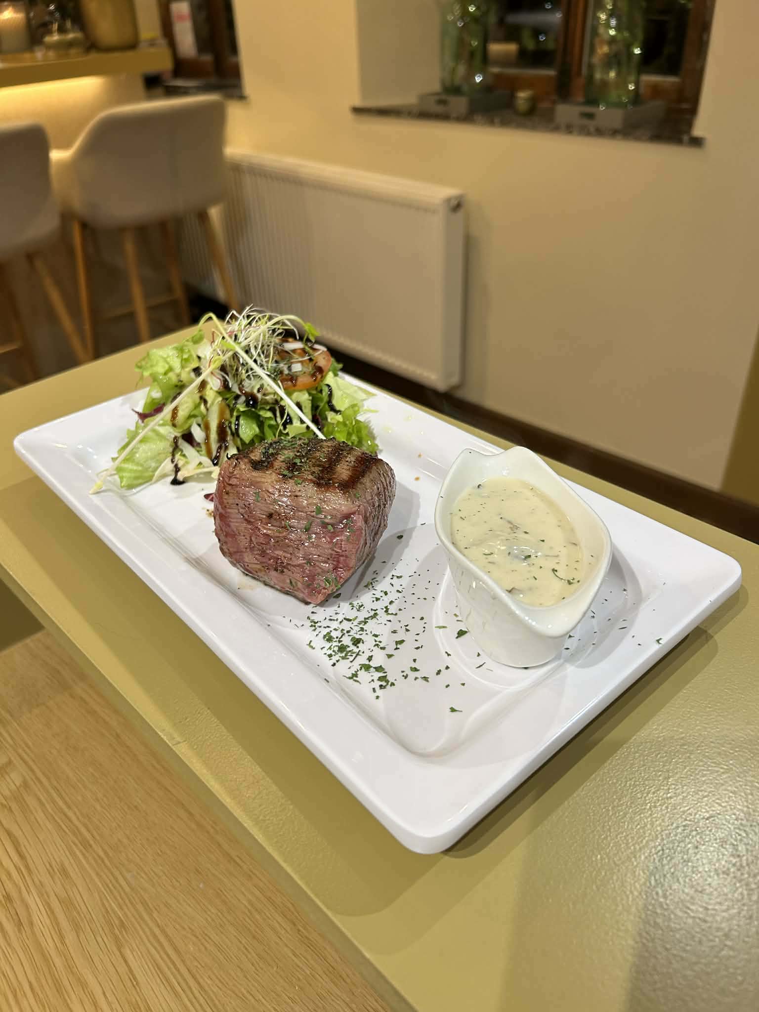 Steak grillé servi avec une sauce au choix (marini, poivre, champignons) et accompagné de frites croustillantes.
