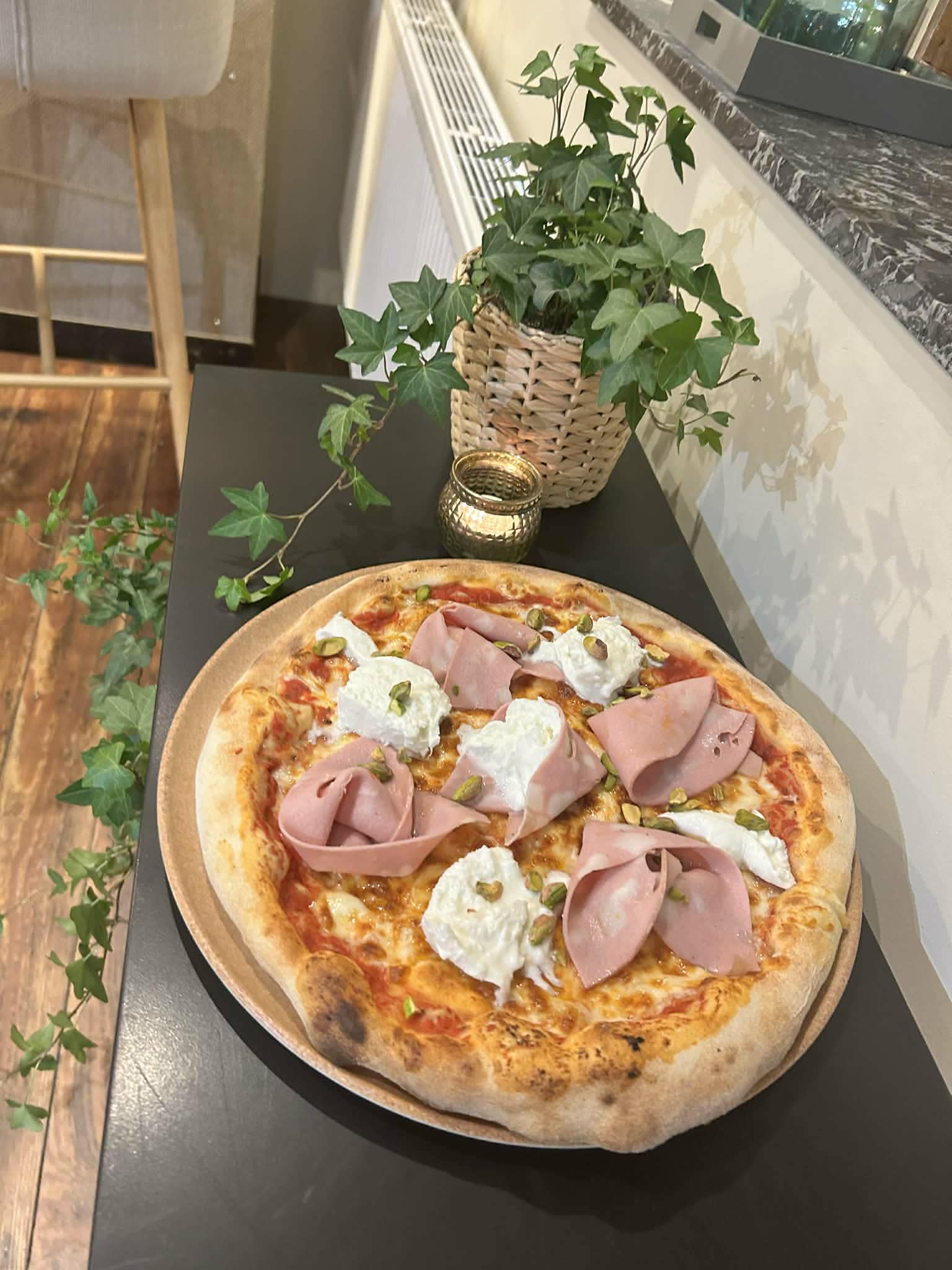 Pizza garnie de mortadelle, burrata crémeuse et éclats de pistache.